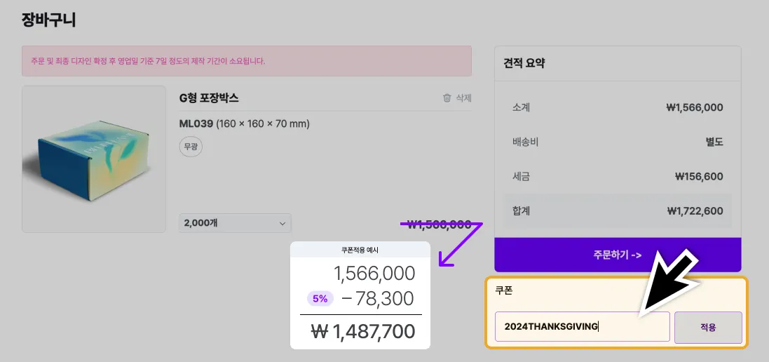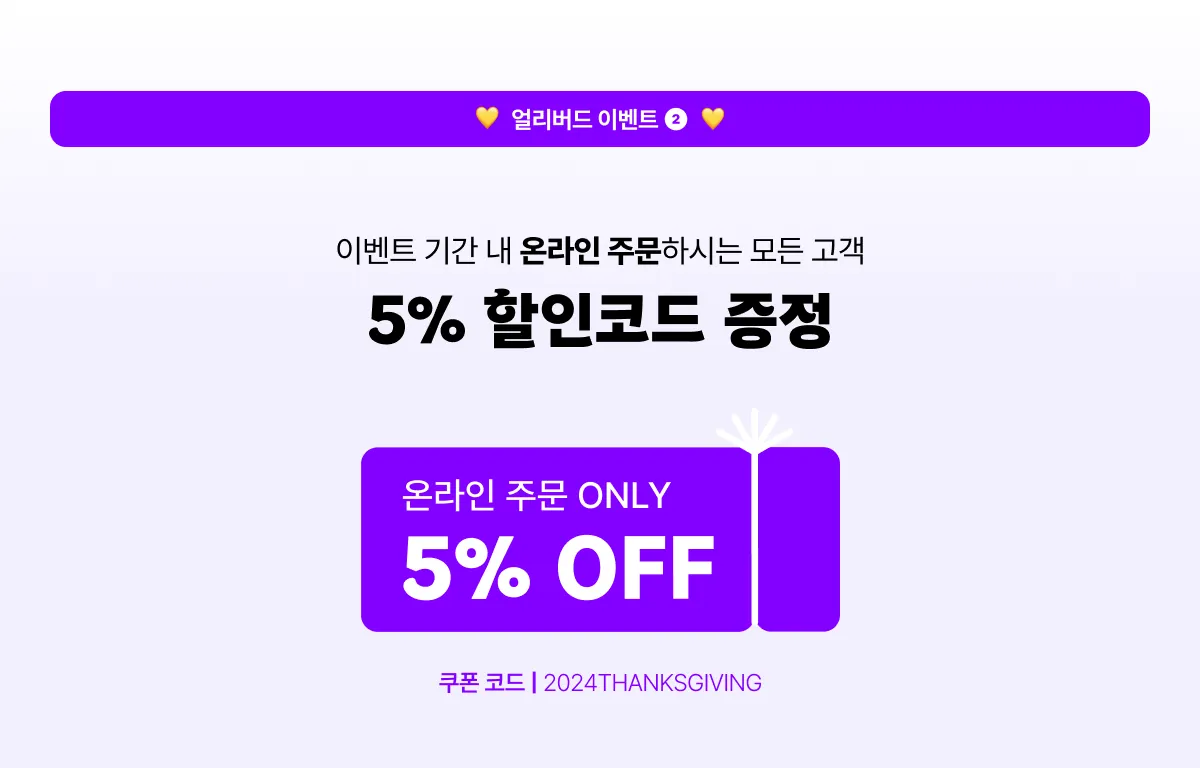 2. ์ฟ ํฐ ์ฝ๋ [2024THANKSGIVING]๋ฅผ ์ ๋ ฅํ์๋ฉด 5% ํ ์ธ์ด ์ ์ฉ๋ ๊ธ์ก์ผ๋ก ์ฃผ๋ฌธ์ด ๊ฐ๋ฅํฉ๋๋ค.